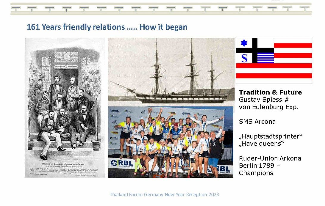 Die 1858 in Danzig vom Stapel gelaufene S.M.S Arcona war das Flaggschiff der aus 3 bemannten Schiffen bestehenden von Eulenburg Expedition, deren Ziel die Erschließung neuer Handelswege und Beziehungen nach der Verhängung russischer Sanktionen gegen „Preußische Tuche“ war. Sie wurde benannt nach dem nördlichsten Kap der Insel Rügen, war eine „Gedeckte Korvette“ der Preußischen Marine, der Marine des Norddeutschen Bundes sowie später der Kaiserlichen Marine bis zu ihrer Abwrackung bzw. Ersetzung. Bis 1914 erhielten alle Flaggschiffe der kaiserlichen Marine den Namen Arcona, wie auch die in der Bucht von Qingdao liegende und noch heute auf dem Logo der Qingdao-Brauerei enthaltene Insel. Unter „Arcona“ verstand die Zeit die Erschließung der Welt. Die auf Empfehlung des sächsischen Kaufmanns Gustav Spiess entsandte „Preußische Ostasienexpedition“, nach ihrem Leiter, dem Grafen Friedrich zu Eulenburg, auch als Eulenburg-Expedition bezeichnet, wurde von der Preußischen Marine von 1859 bis 1862 in Ostasien durchgeführt. Als Ergebnis wurden Freundschafts-, Handels- und Schiffahrtsverträge mit ostasiatischen Staaten abgeschlossen: mit Japan am 24. Januar 1861, mit China am 2. September 1861 und mit Siam am 7. Februar 1862. China würdigt diesen Vertrag nícht offiziell wegen des Bezugs zum kolonialen Erbe. Gleichwohl werden die Beziehungen zu Deutschland ganz besonders in Qingdao gepflegt. Eine Delegation des China Forum Berlin begab sich im November 2014 nach Qingdao und konnte in der Nacht des 100-jährigen Endes der deutschen Besetzung Chinas nach dem Ende des deutsch-japanischen Krieges dem Jubiläum würdig gedenken.
